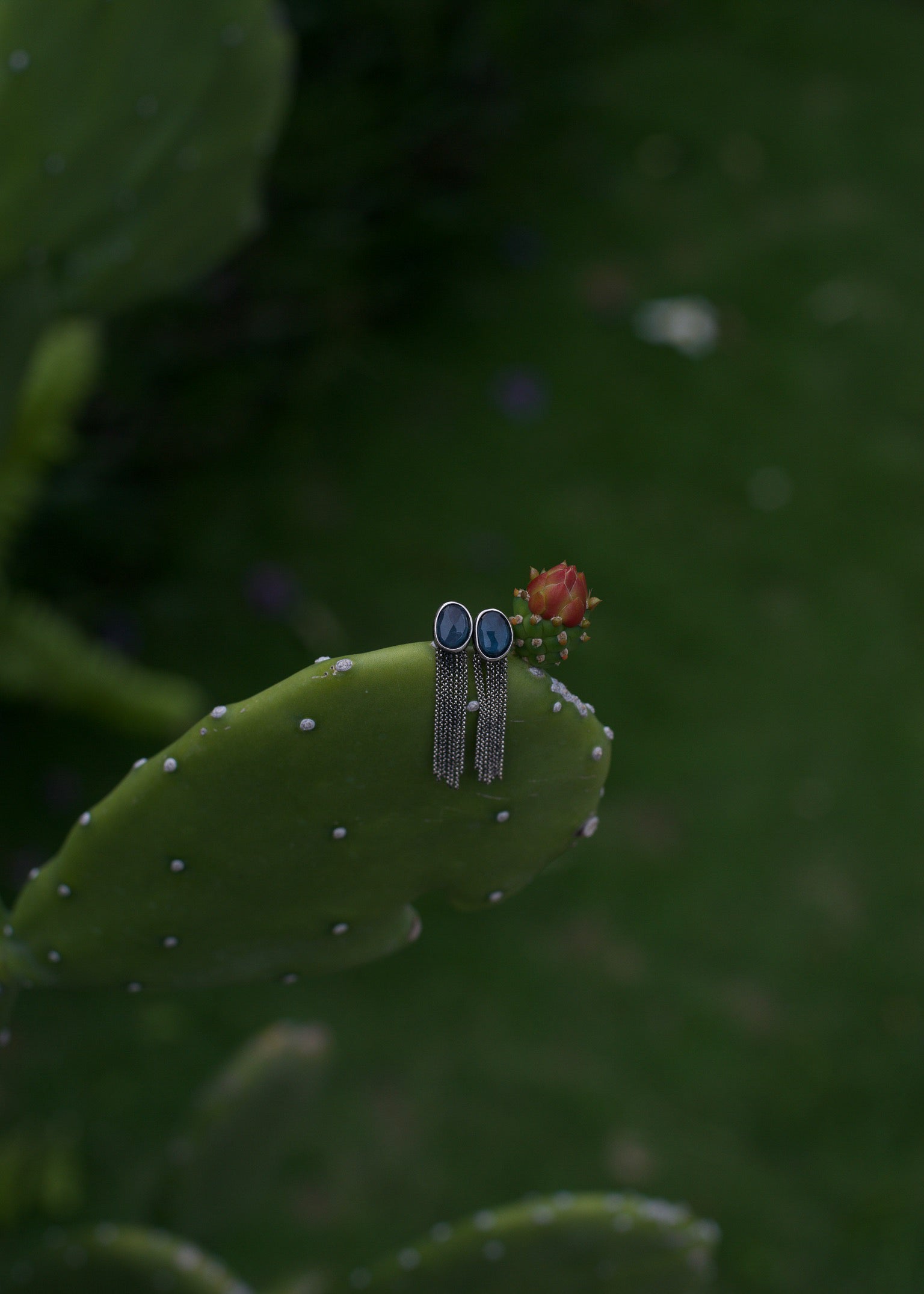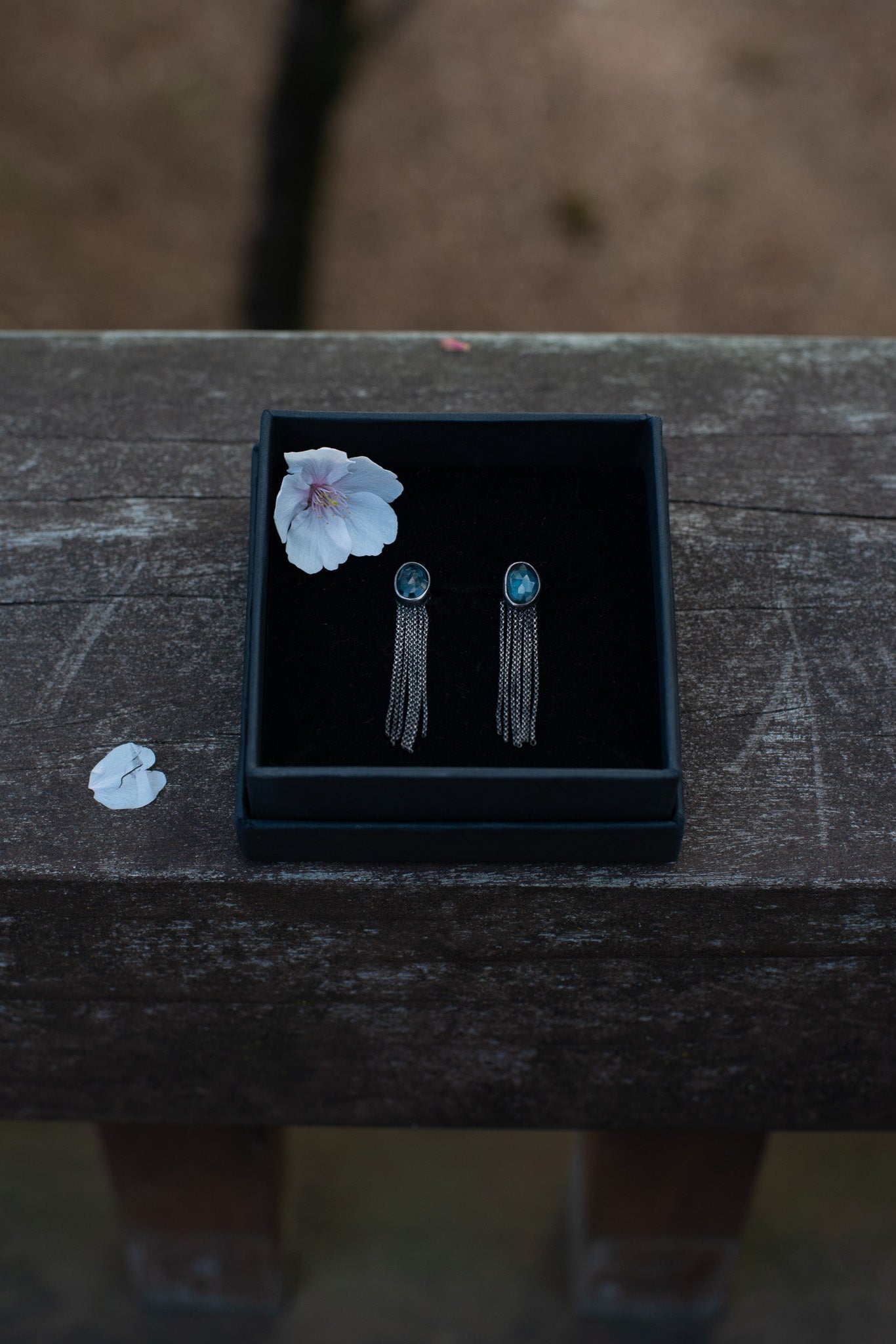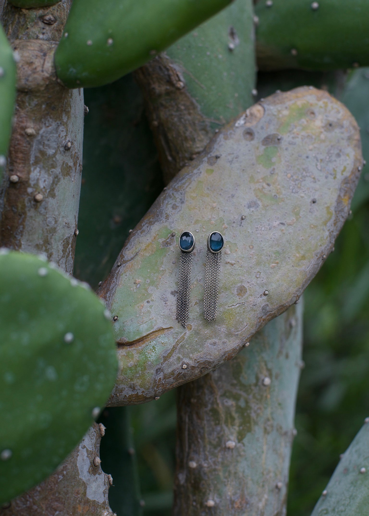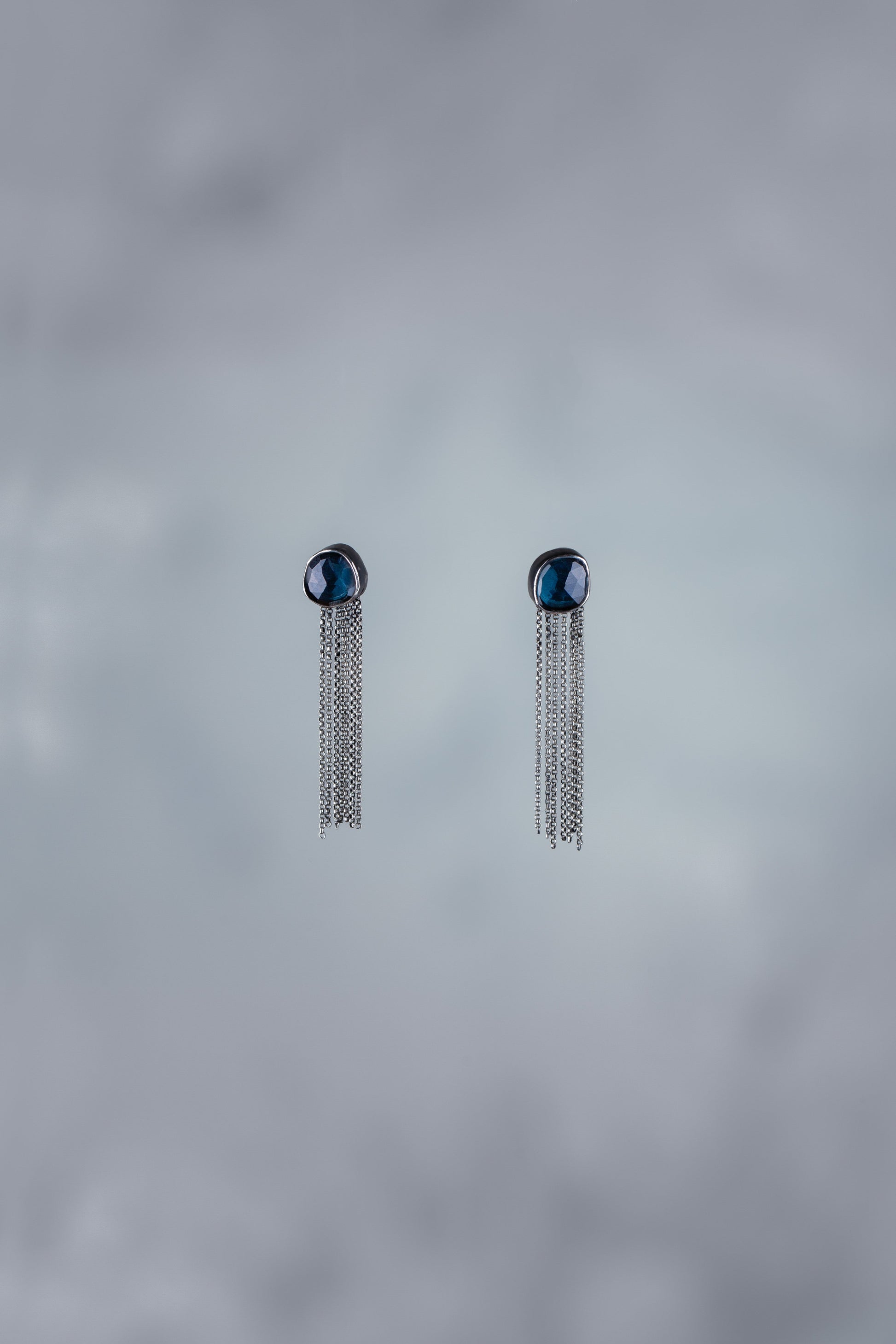 Sweet, simple studs showcase the faceted face of deep Blue Topaz. Delicate chains dangle below, offering movement beyond the basic.